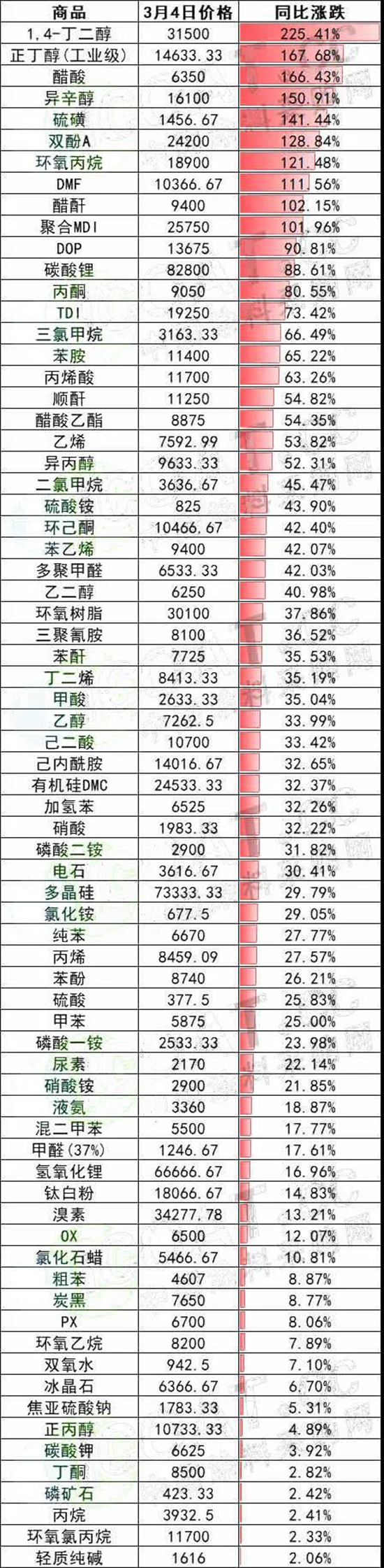 2021年节后归来,众多化工原材料开启了“飙涨”模式。化工原材料的价格相较2020年初,有了巨大的飞跃,部分原材料同比涨幅甚至超过200%!正丁醇同比上涨167.68%,醋酸同比上涨166.43%,异辛醇同比上涨150.91%,硫磺同比上涨150.91%。双酚A、环氧丙烷、DMF、醋酐、聚合MDI等同比上涨超过100%,丙酮、TDI、三氯甲烷、苯胺、乙烯、异丙醇等原材料同比上涨50%以上。